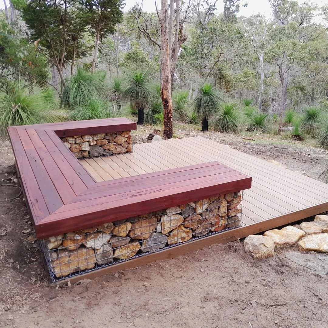 Bush Lookout - Jarrah and Granite Gabion Bench - Design and Build by @bbackyardcreations Composite decking and timber bench Decking Extension
